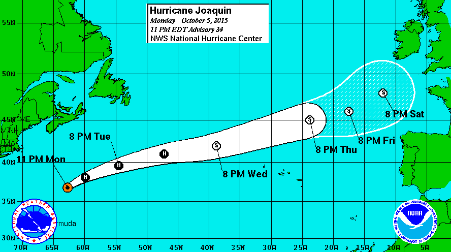 Hurricane Joaquin brushed near to Bermuda on Sunday with gusts over 70mph, heavy rain and large swell affecting the Atlantic island. It's path NW keeps it far away from continental land, no warnings from the Canadian Met. Service and it will continue tracking towards W.Europe for the end of this week.