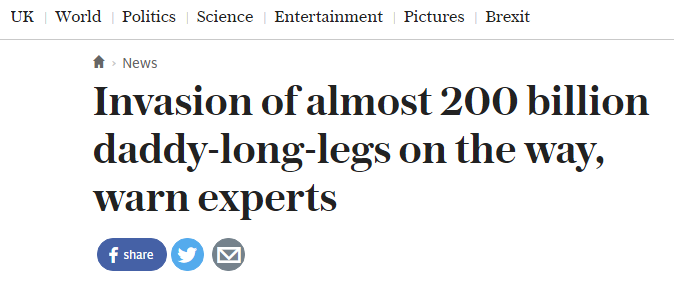 “ Media reports today appear to have misunderstood a comment from Buglife about the spider Pholcus phalangoides and used it for a story about craneflies. Daddy longlegs is a common name for three types of invertebrates in the UK: the Cellar spider (Pholcus phalangoides), craneflies (Tipulidae), and Harvestmen (Opiliones). Pholcus phalangoides seems to be extending its range northwards, possibly as a result of a warming climate.”