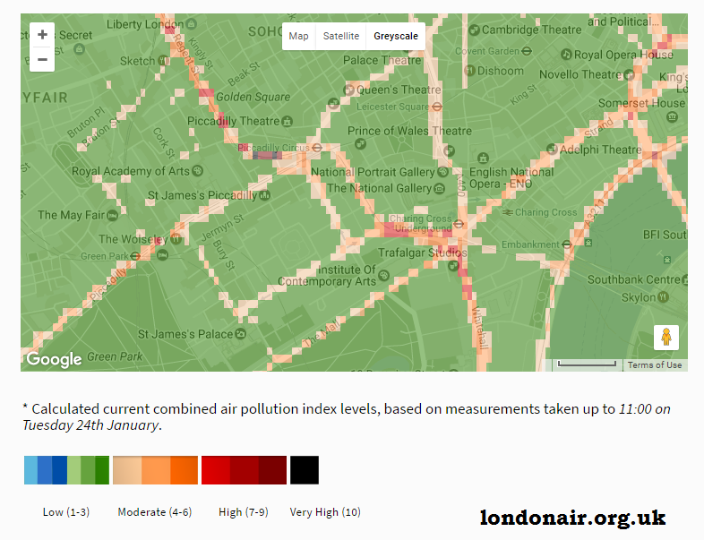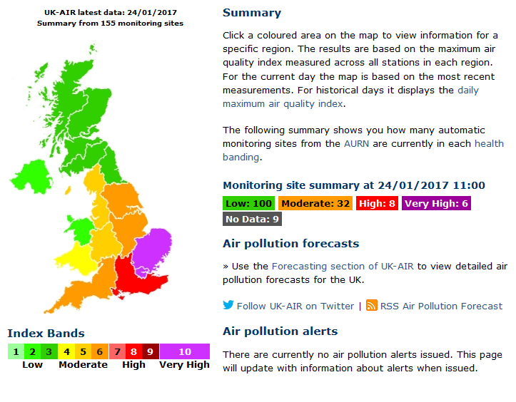 There are different ways of viewing the pollution levels where you are throughout the day. Air quality figures with low, moderate, high and very high levels from Londonair at Kings College. The sites at Lambeth Bondway interchange and Brent Ikea recorded a 10 each with Very High levels of pollution midweek. Most winter air pollution 'episodes' are a result of road transport pollution.