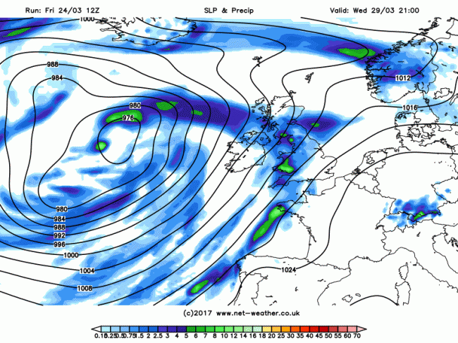 Tonight and Saturday night we could see temperatures fall below freezing in rural parts of the north and west of Britain, perhaps as low as -3C. But during tomorrow and Sunday temperatures could reach a warm 16-18C in the same areas. This large difference temperatures between day and night is known as a large ‘diurnal range’. Under similar pressure and airmass conditions in winter, it would likely stay cold during the day after frosty nights even with the sunshine, but with longer daylight and the sun higher in the sky and stronger in late March, the days warm up quickly.