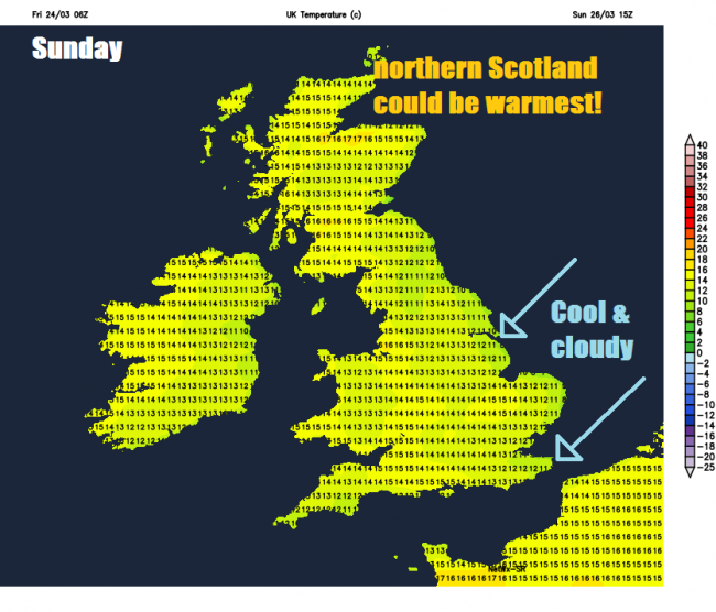 High pressure is building in across the UK, centred over northern Britain over the weekend and into beginning of next week. The highest daytime temperatures could be across more northern and western areas of Britain this weekend where we will see lighter winds. A brisk and chilly easterly wind across SE England and E Anglia, normally the warmest part of the UK, will keep temperatures pegged back into low double figures. The far southwest of England, west Wales, western Ireland and parts of Scotland could be the warmest spots on Saturday with daytime temperatures perhaps reaching 16-18C in a few spots. On Sunday, northern Scotland could be the warmest spot with 17-18C, though western areas of the UK could see temperatures reaching the mid-teens. Cooler and cloudier across eastern England with that nagging northeast wind.