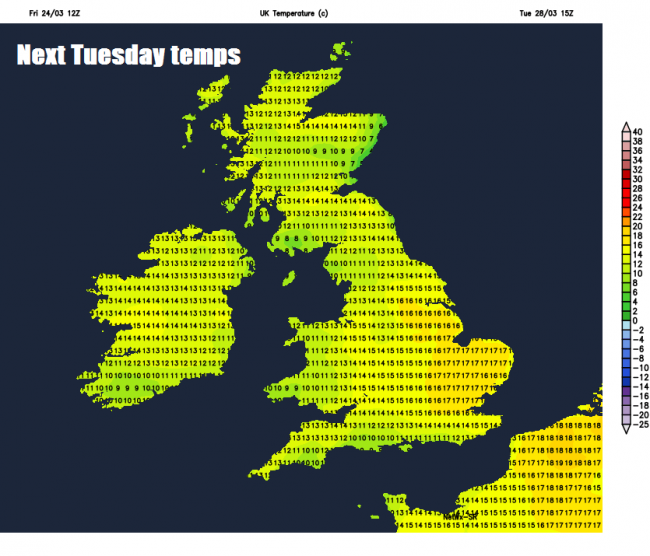 It looks like the nights will warm up from Tuesday too, as the southerly flow brings in milder air, with night-time temperatures in the south perhaps staying in low double figures.