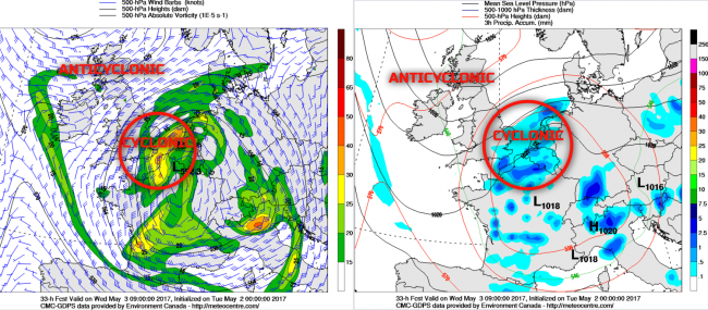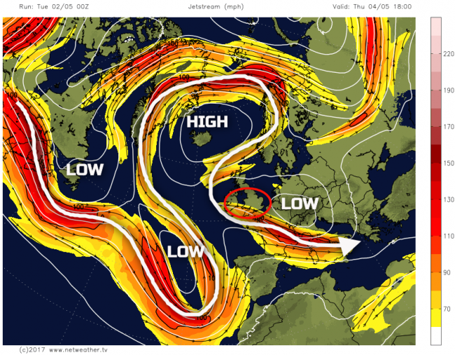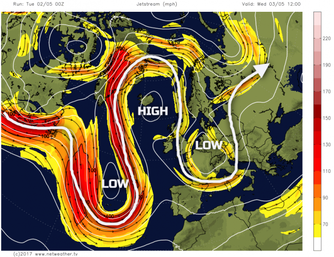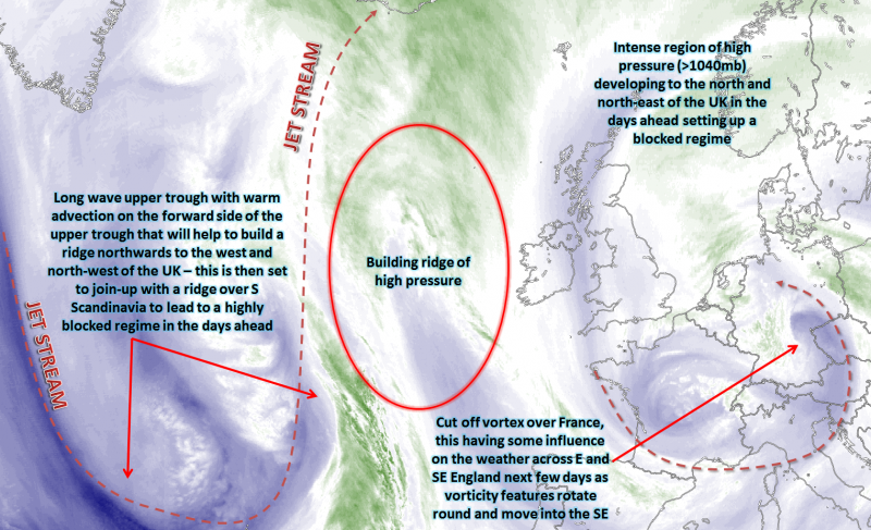 Wed 3rd May: Into Wednesday and the two primary features of interest across the N Atlantic and into Europe are that of a long wave upper trough over the North Atlantic and a developing large area of high pressure over Scandinavia. The long wave upper trough, in prior days, will have helped to build a ridge northwards to ‘join forces’ with a ridge over Scandinavia to then develop the main surface and upper blocking high pressure. The WAA (warm air advection) on the forward side of the long wave trough is one of the primary reasons GPH (Geopotential Heights) increases and that process has been in evidence over the last day or so. There is, however, a weakening upper vortex just to the SE of England, this will continue to have some mesoscale influence on the weather across more southern and south-eastern areas of England.