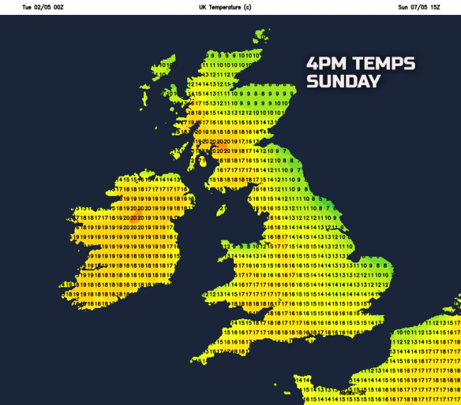 Some chilly nights may well be possible into the weekend though, primarily in association with a reduction in wind speed. However, as our current MR model highlights by Sunday, some northern and western areas of the UK, especially to the W of high ground, could have temperatures up to 18C to 20C. Some favoured locations could be W and SW Scotland, Ireland in general, NW England, Wales and SW England too. As a result, the current summary for the weekend is for settled and pleasantly warm conditions for most with lighter winds than previous days.