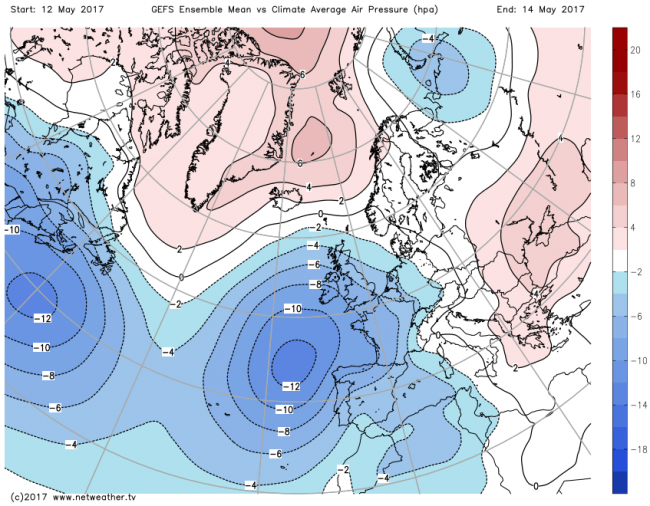 Beyond this period, towards mid-month or so and the overall consensus is for low pressure and unsettled conditions to become established across all areas of the British Isles. The 00Z GEFS ENS Mean v Climate Average Air Pressure (hPa), clearly shows a –ve anomaly regarding pressure across the UK and to the SW. So, while the opening week or so of May is likely to produce some very pleasant weather, as the month of May progresses then a far more unsettled and cooler period of weather is most likely at the moment.