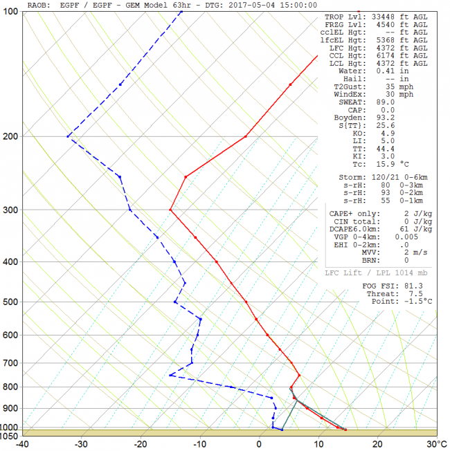 Thu 4th May: As we progress into Thursday and, once again, there will continue to be quite a distinct difference in conditions across the UK, despite what is a full progression towards more settled weather. The main surface blocking high pressure will remain slow moving (quasi-stationary) to the N of the UK. The high will continue to maintain excellent weather across many northern and western areas, with further spells of sunshine across Scotland, Ireland and N England. The forecast sounding for Glasgow on Thursday afternoon shows a dry atmospheric profile. There may well be some high based Cu clouds developing through the day, but otherwise, a lot of cloud-free skies are likely. There will, however, be a noticeable breeze from the E, especially to the W of higher ground where it could be quite gusty.