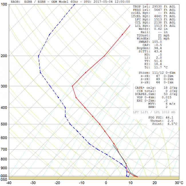 Using a forecast sounding for Birmingham as an example, it clearly shows far more moisture within the mid and lower levels of the atmosphere, then compared with the sounding from Glasgow, of which will leads to the forecast that at a lot more cloud will be present. The cloud is likely to be thick enough to for some patchy light rain or showers moving westwards.
