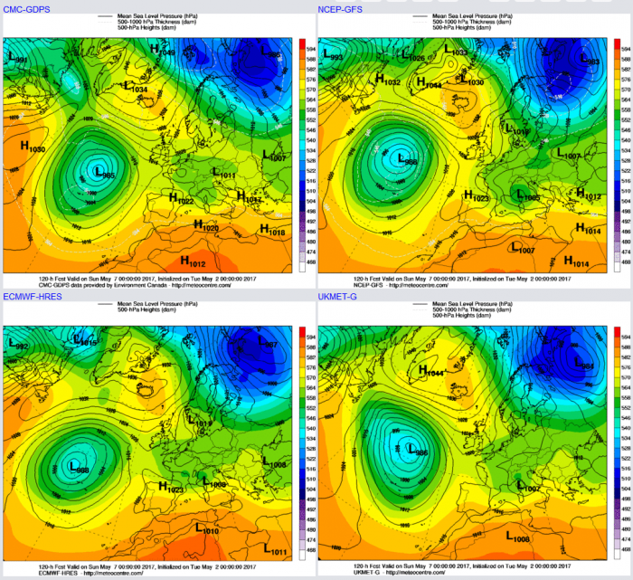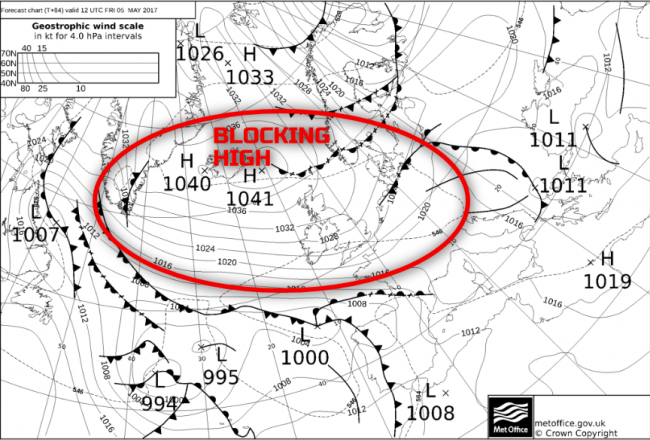 Fri 5th May: We end the working week with a good model agreement between the GM’s (UKMO, GFS, ECMWF and GEM) for the high pressure to continue to be the dominant feature of the weather. Any forcing and vorticity across more central and southern areas of the British Isles will have cleared, as things stand, and most areas of the UK will have a dry and benign day of weather. The strong E or SE’ly wind will, however, continue and this will maintain a cooler feel to the weather across areas nearest to the North Sea. The consensus to is that most of Scotland, Ireland and N England, especially western regions, will have the best of sunshine still, whereas further S and E, then more cloud is likely to develop through the day. The overall synoptic pattern for the end of the week is highlighted well the 00Z T+84hr FAX from the UKMO, noting the large and dominant anticyclone just to the N.