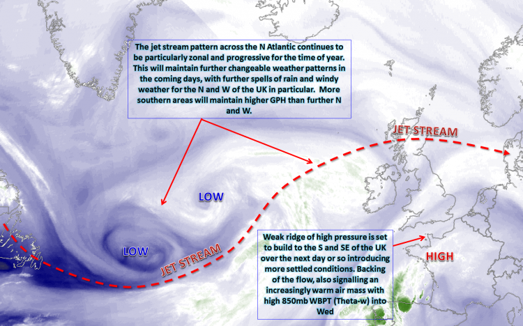 However, trying to put some detail on to the forecast and, from experience too, that it is likely that Scotland and Ireland will be unsettled. The flow is more cyclonic here over the weekend leading to cloudier conditions, perhaps with some relatively light or moderate frontal precipitation too. However, for much of central and southern areas of England and Wales, at least, it looks a decent weekend. Bright or sunny spells and with a returning Tm air mass then temperatures will likely be on the rise with it becoming warm or very warm again. N England is an unusually uncertain region as this area will be on the boundary of these two weather types, so potentially mainly dry for N England, but if the flow is less amplified than even N England may have a rather cloudy weekend, with perhaps some precipitation developing at times.