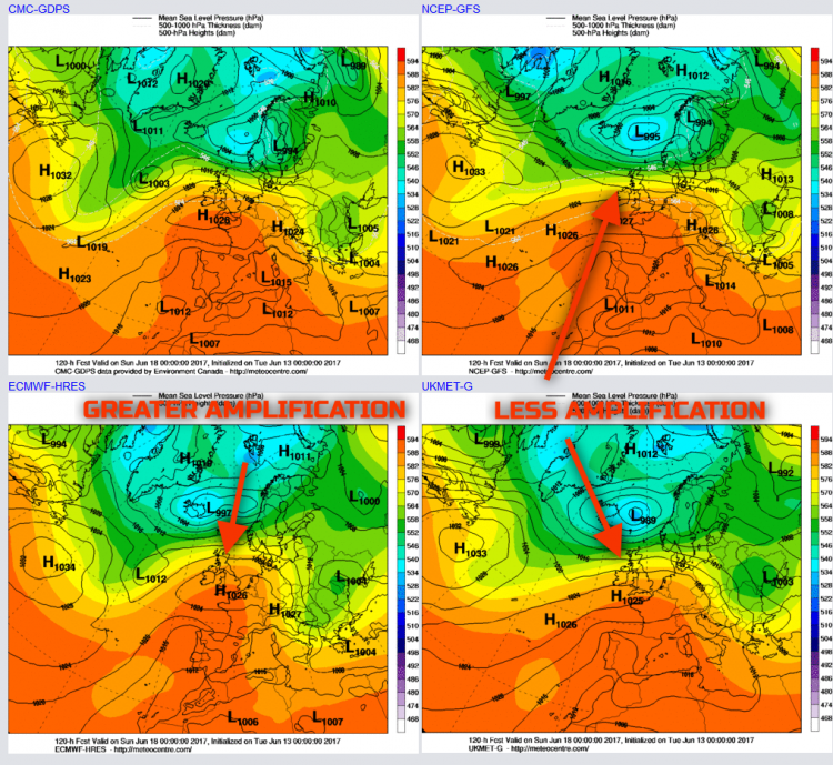 Taking a look at the 00Z GM’s for T+120hr, so 0000Z Sun 18th, you can see there are differences over the amplification of the pattern across the UK. The most amplified being the ECMWF; this has got the majority of the UK beneath an anticyclone and all the usual conditions that will arrive at this time of year. However, the UKMO and GFS, for example, don’t extend the ridge as far N as the 00Z ECMWF, with more of a cyclonic W’ly or even WNW’ly flow from the GFS, across parts of the N and W of the UK. This variation is unlikely to be resolved for a few days yet.