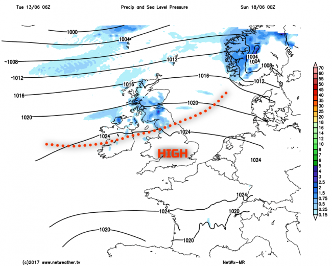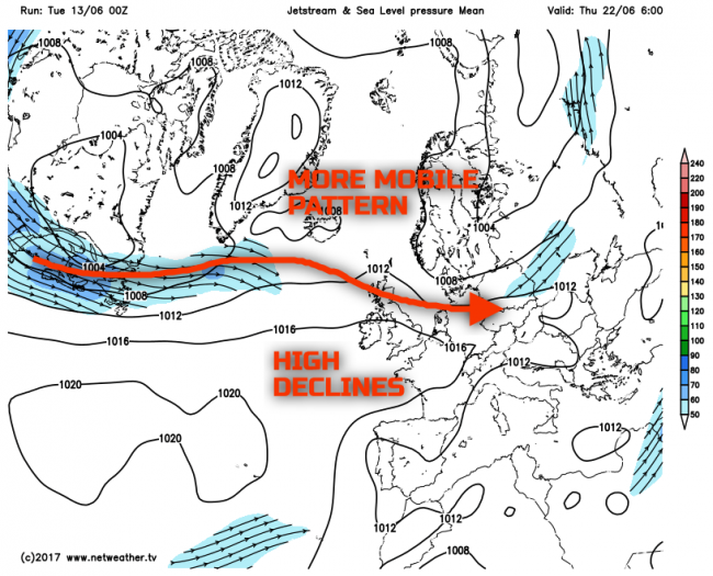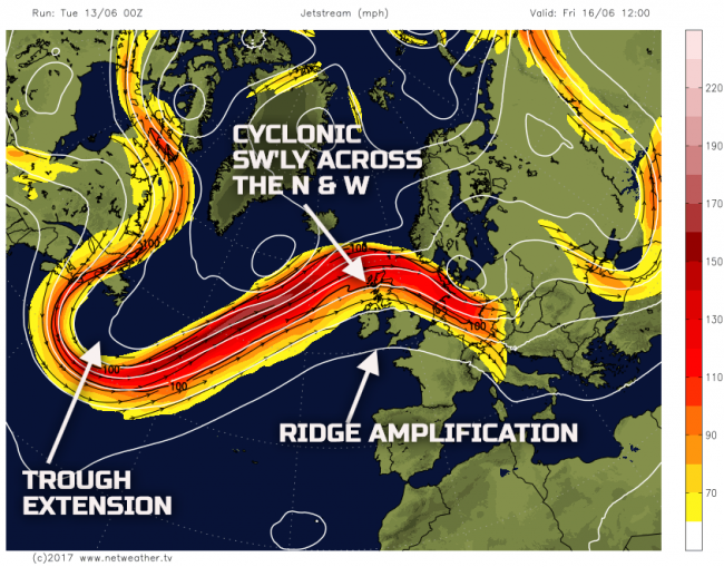 Sat 17th and Sun 18th June: So, we move into the coming weekend with an increasingly amplified pattern across the N Atlantic, but this is when model divergence becomes apparent. This particular synoptic pattern is often shrouded in uncertainty because the flow can be both cyclonic, across parts of the N and W, but equally anticyclonic across the S and E. It is often difficult for forecast models to determine how much of each is likely across the UK and the coming weekend is no different.