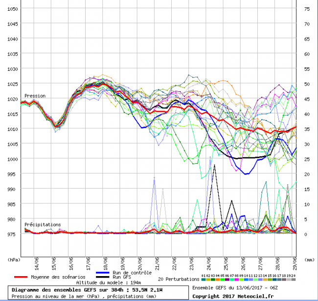 Finally, supporting this idea is the latest (06Z 13Jun17) GFGS ENS data as well. While it is a gradual and stepped process, taking N England as an example, you can see that overall from the middle of the month onwards pressure does gradually decline and this also coincides with an increasing precipitation signal too. As a result, in summary, a more unsettled end to June is the most likely option at the moment, perhaps with some thundery conditions.