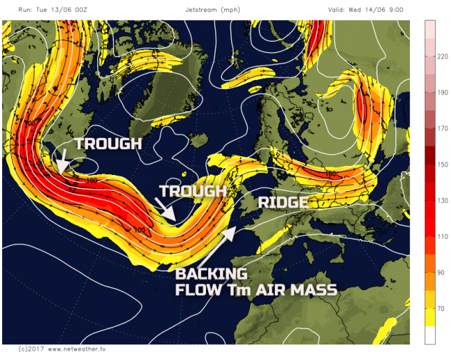 Wed 14th June: Into Wednesday and there is a good model agreement between the ECMWF, UKMO, GFS and GEM, along with the HRES models, for an upper trough to be approaching from the W and SW of the UK. Downstream of this, over and just to the S and SE of the UK will be a temporary rise in GPH. The backing of the flow across the British Isles through Wednesday, as the trough approaches, means a marked 850mb theta-w plume across the UK and so one of the warmest days, in quite some time, will arrive. The overall flow though across the N Atlantic and into NW Europe remains a rather zonal and progressive one, so this development of very warm conditions will be short-lived.