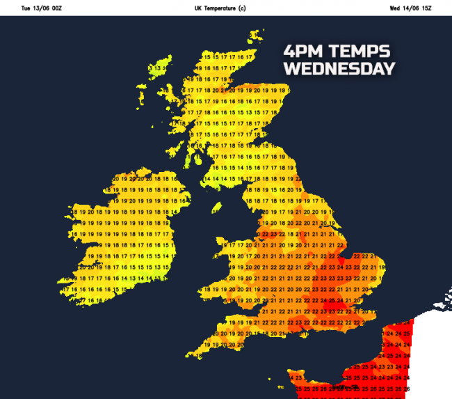 It will be the warmest day in quite some time with temperatures widely 16C to 20C across Scotland and Ireland and between 18C and 22C across England and Wales. However, some central and southern counties of England will likely see temperatures rise to 23C to 25C through the afternoon, depending on local and regional cloud amounts.