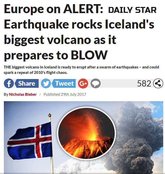 Away to the NW, there are rumblings, the earth is stirring, and it could affect the UK. Volcanic ash might cause flight chaos, and there would be ranting families, major disruption, compensation claims, airport scenes – summer holiday news. Remember Eyjafjallajökull? Don’t worry; no one is going to ask you to pronounce it. This Icelandic volcano did erupt in 2010 and threw ash over NW European airspace in the Easter holidays. Now there is Katla (or Myrdalsjokull ), and the Daily Star are excited/worried for you.