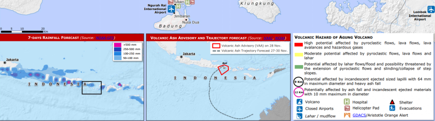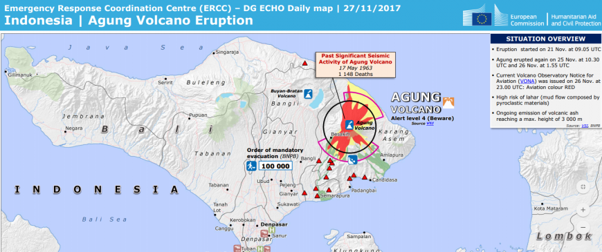 Mount Agung, an active volcano in Karangasem Regency in East Bali, has emitted ash from eruptions since 21 November 2017. Volcanic activity may escalate with little or no notice. On 27 November, Bali airport closed and depending on weather conditions the ash cloud could close other airports in Indonesia. Contact your airline or tour operator for up-to-date information (see Additional Information). On 27 November, the alert warning level issued by Indonesia's National Disaster Management Authority was raised to level 4 of 4. Monitor local media reports, follow the instructions of local authorities and stay outside the exclusion zone around the crater. Contact your airline or tour operator directly for up-to-date information on flight options.