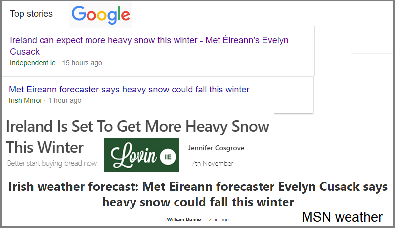 Met Eireann have issued their Winter Ready campaign looking at weather, flooding, older people, schools and other areas such as health. Met Eireann (the Irish Met service) and the UK Met Office have worked closely over recent years in the Name our Storms project, to raise awareness of incoming severe weather across Great Britain and Ireland. Some Irish newspapers have had headlines, after the launch on Nov 7th 2018, of heavy snow for this winter. That's not what Evelyn Cusack, head of forecasting said but when did that stop certain media outlets. Then others whom you might have hoped would do better, just copying and pasting the incorrect story. Disappointing churnalism.
