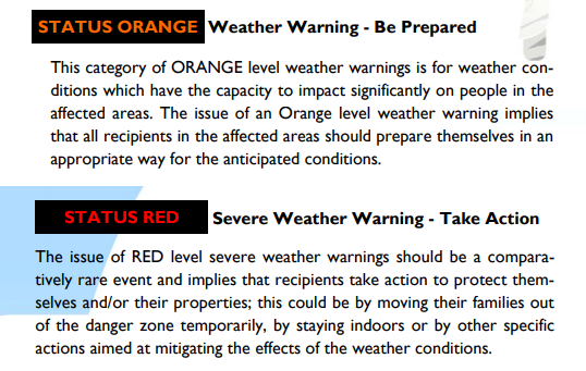 Also looking at what the levels of weather warnings mean; Met Eireann are moving away from the numerical category of warnings, say gusts over 50mph = yellow wind warning, 40mm of rain in an hour a rain warning. There are now mentions of impacts driving the warnings, although they now include Be aware, Be prepared and Take Action which the UK Met Office dropped recently, when reviewing their longer standing impact based warning system.