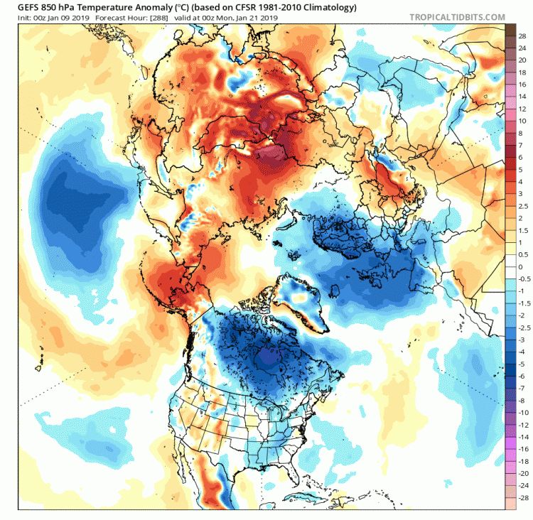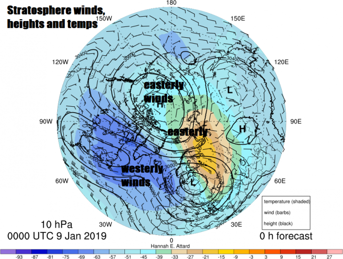 This pattern change later this month is probably linked with continued eventual‘flushing’ down of the negative wind anomalies / easterly winds in the stratosphere – which are taking their time but will likely reach the top of the troposphere in the next 10 days – this will then alter the troposphere flow patterns to favour more high latitude blocking over Atlantic as the easterly winds propagating down weaken that troublesome Canadian vortex which will push a lot upper flow energy over the Atlantic in the next 10 days.