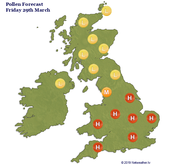 Today the pollen count is forecast to be high across much England and Wales, medium to low across northern England, low across Scotland and Northern Ireland – where we have more in the way of cloud. The pollen at the moment mostly produce by trees. High pollen levels are forecast to become confined to SE England and East Anglia on Saturday, then the forecast for Sunday is low in the north to medium in the south, probably due to lower temperatures than today, as cooler and fresher conditions spread down from the northwest
