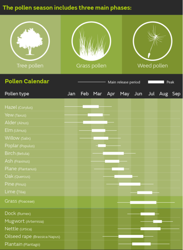The chart below (courtesy of the Met Office) shows the main release periods and peaks of pollen from trees, grass, weeds, crops, etc.