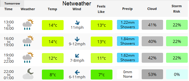 This is the BBC output, it looks quite ominous and does get interpreted as rain all day but that isn't the case. It shows there is a chance of showers for much of the day. But looking at the row below with the blue raindrops, the percentage chance of rain is quite low. The chance of a shower is about 1 in 4. It's a bit hard to apply the % to showers especially if its 50%. However applying categories of very likely, evens and not very likely can work. So 25% equals the chance of a shower but don't worry too much.