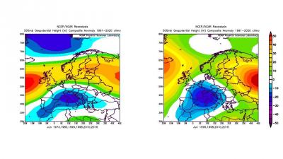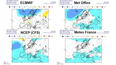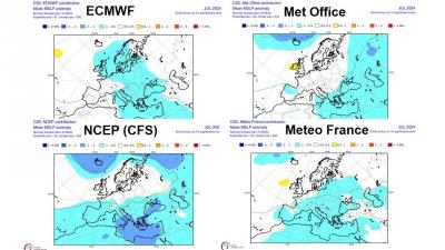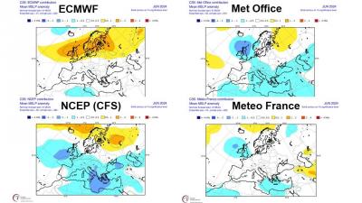 A look at July, again ECMWF looks more on it’s own, with signal for lower pressure over northern and eastern Europe, while UKMO, NCEP and Meteo France have lower pressure towards Iceland and southern Europe, average or slightly higher pressure tendency in between.