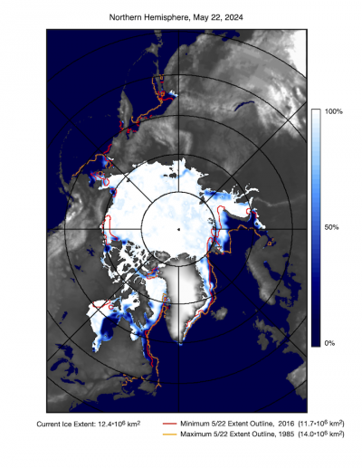 The average Arctic Sea ice extent for April 2024 was 14.12 million square kilometres (5.45 million square miles), placing it sixteenth lowest in the passive microwave satellite record (Figure 1a and 1b). As of the beginning of May, extent is well below average in the Sea of Okhotsk, and slightly below average in the Bering and Barents Seas and off the coast of Labrador. Ice is near the average position along the eastern coast of Greenland.
