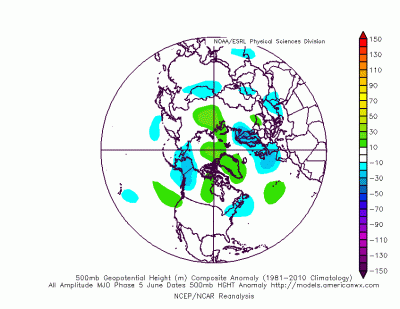 The Madden-Julian Oscillation (MJO) is currently entering phase 4 in the Maritime Continent and is expected to continue into phase 5 toward the last few days of May and first week of June. It may briefly reach phase 6 in week 2 of June before collapsing into the Circle of Death sometime during that week. Phase 5 composite for June tends to promote low pressure over western Europe, so something we’ll consider.