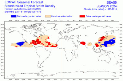 Enhanced Tropical Storm activity forecast over the tropical N Atlantic could influence mid-latitude weather patterns later in the summer.